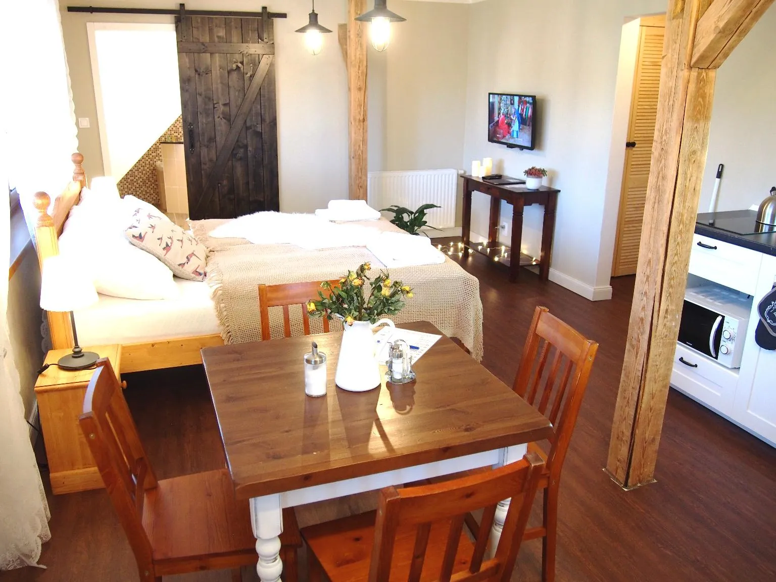 Pokoj se nachází v prvním patře. Také zde se budete probouzet při pohledu na kopce Pusteven. Pokoj má vlastní kuchyňský kout, koupelnu a WC. V pokoji vyniká cihlová zeď a mile Vás překvapí i výhled během koupele, který se přímo nabízí.