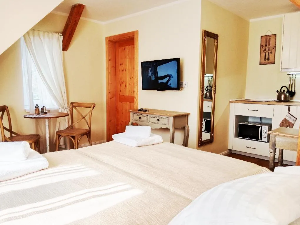 Pokoj se nachází v prvním patře. Zde se naskýtá výhled na zahradu a také můžete částečně spatřit vrcholky Pusteven. V povzdálí můžete spatřit i Lysou horu. Pokoj má vlastní kuchyňský kout, koupelnu a WC. Nachází se zde jedna dvoulůžková manželská postel a dvě dětská lůžka. Pokoj je vhodný pro páry s dětmi a je velmi prostorný.